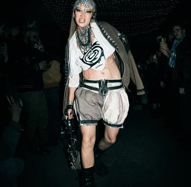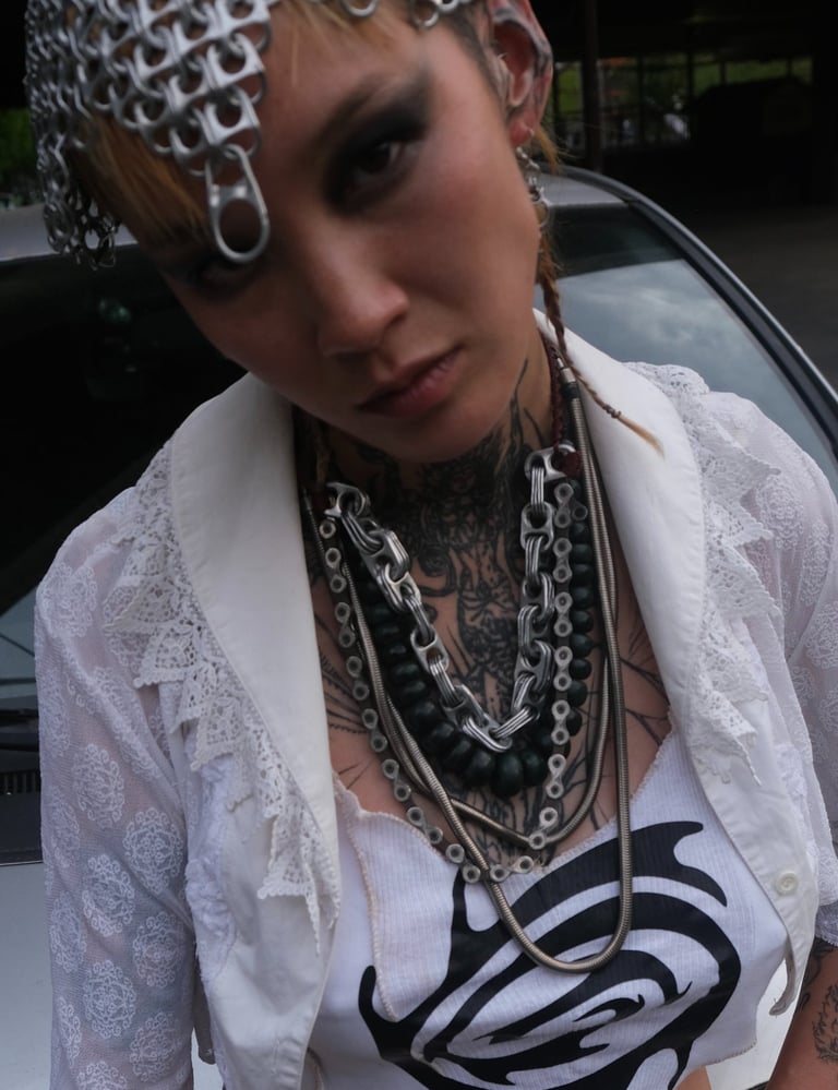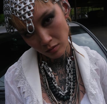 Défilé collectif et vente de pièces au Second Marché, autour d'un thème néo-médieval. Présentation de deux full looks upcyclés mêlant crochet de languettes de canettes recyclées, chambres à air, tissus deadstock et détails métalliques, dans un vestiaire couture brut, artisanal & expérimental.